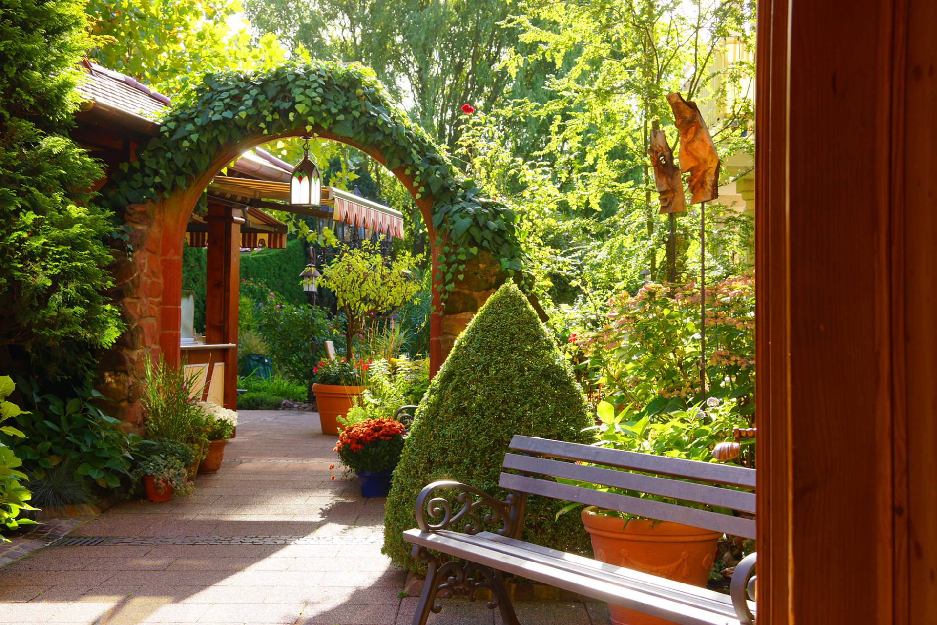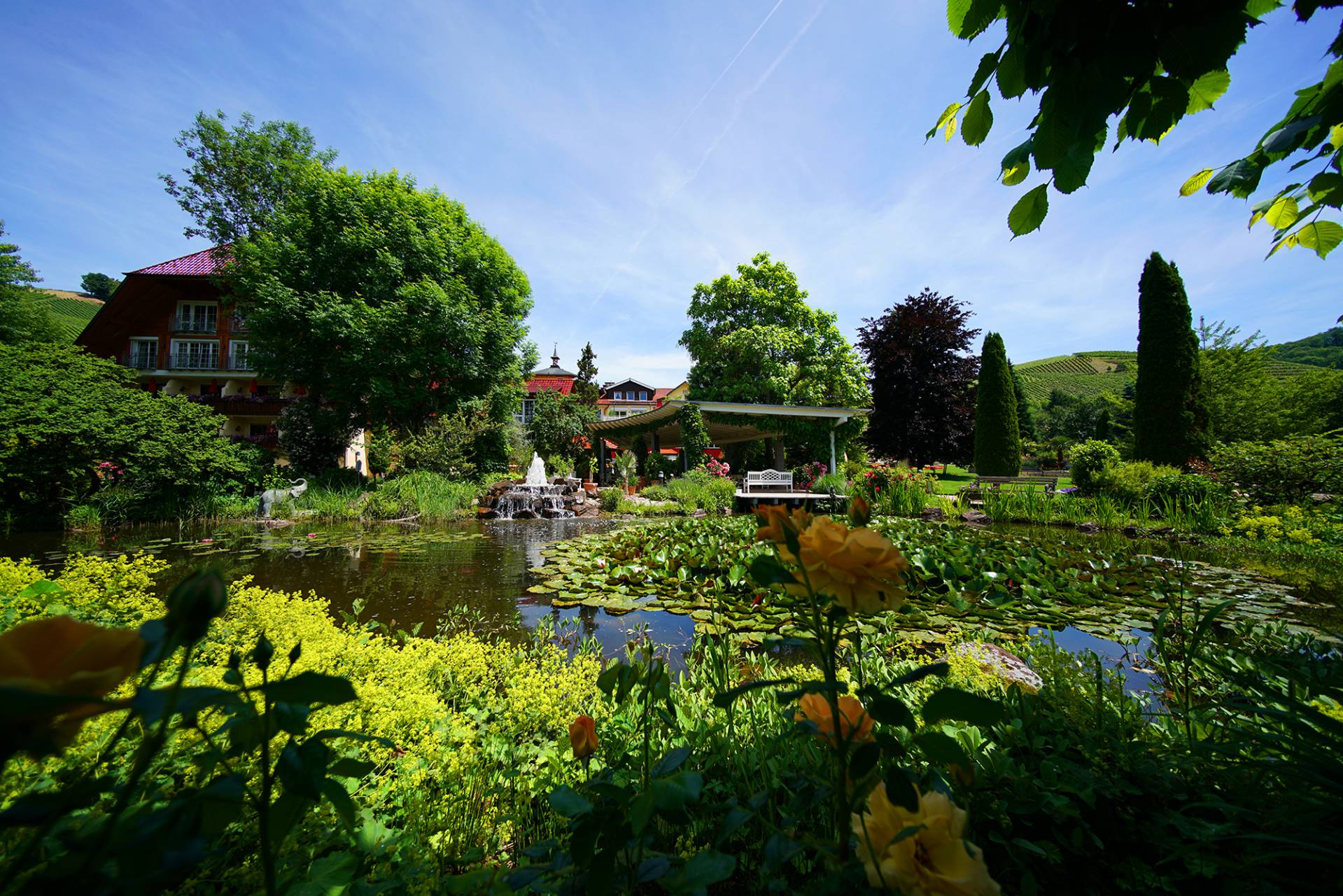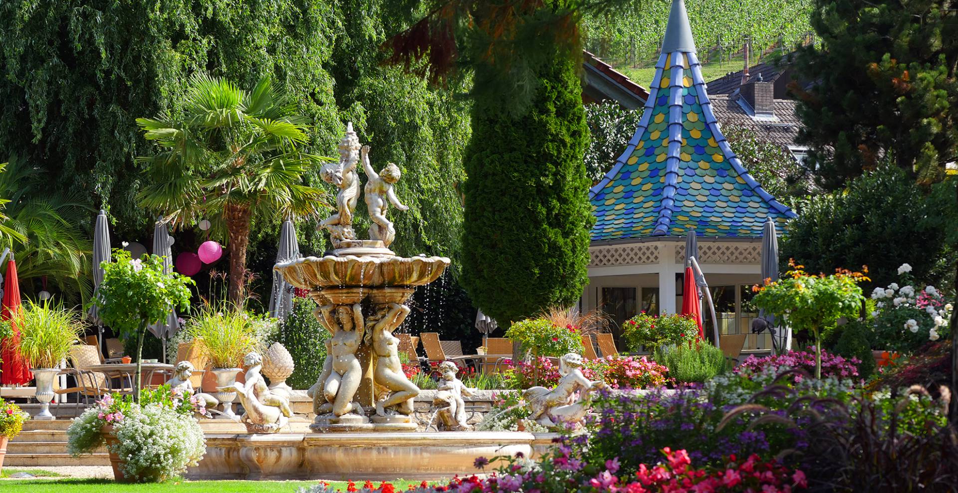 Parkbrunnen in Durbach zwischen Blumen und Bäumen