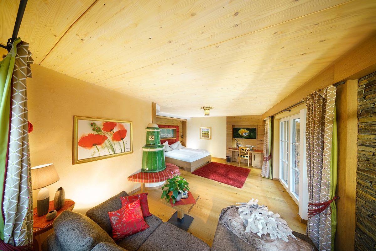 Im Wohnbereich finden Sie eine große Couchgarnitur, Minibar, einen Kachelofen und einen Schreibtisch. Doppelwaschtisch im Bad mit Dusche, WC und Radio sind ebenso selbstverständlich, wie der breitformatige LCD- Internetfernseher, Telefon und kostenloser W-LAN und LAN Anschluss.