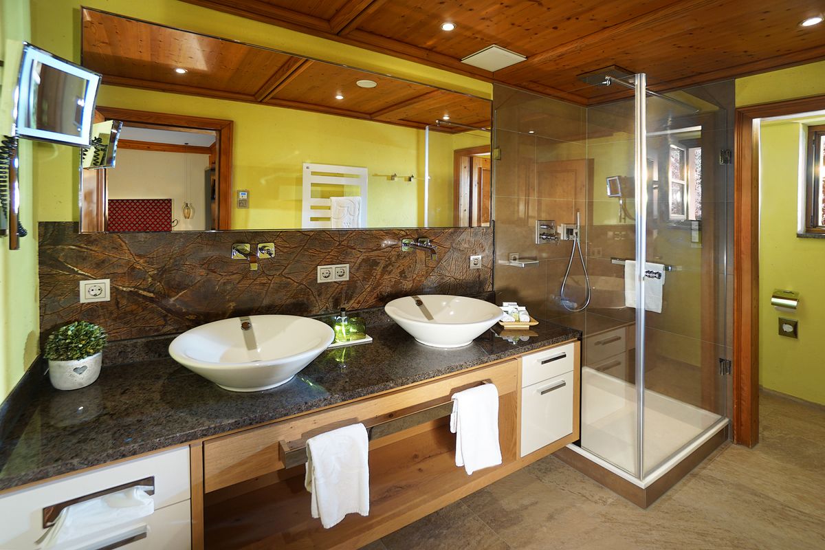 Grande terrasse de toit avec vue sur les vignes. Salle de bain avec WC séparé, douche, miroir de beauté et deux lavabos.