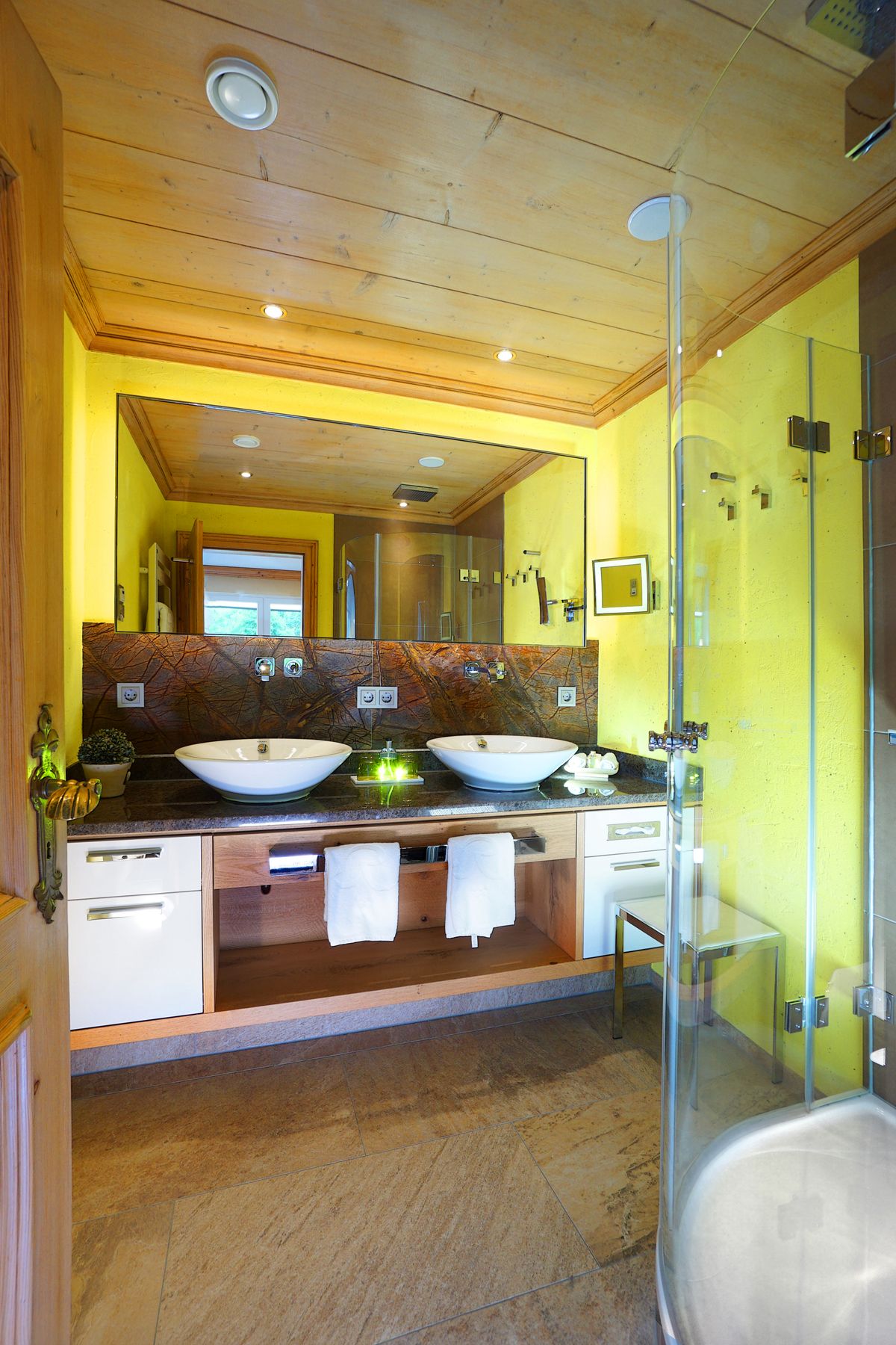 Grande terrasse de toit avec vue sur les vignes. Salle de bain avec WC séparé, douche, miroir de beauté et deux lavabos.